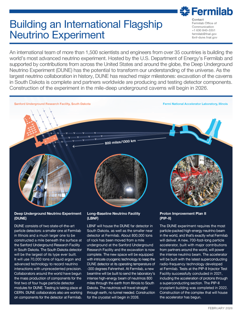 DUNE will consist of two neutrino detectors placed in the world’s most intense neutrino beam. One detector will record particle interactions near the source of the beam, at the Fermi National Accelerator Laboratory in Batavia, Illinois. A second, much larger, detector will be installed more than a kilometer underground at the Sanford Underground Research Laboratory in Lead, South Dakota — 1,300 kilometers downstream of the source. These detectors will enable scientists to search for new subatomic phenomena and potentially transform our understanding of neutrinos and their role in the universe.